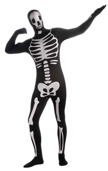 Der Ganzkörperanzug ist schwarz und ist komplett geschlossen.Auf der Vorderseite ist ein Skelett aufgedruckt.Der Reißverschluss garantiert schnelles An und Ausziehen