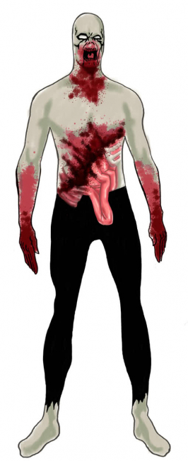Der Zombie Skin Suit schwarz/ beige mit blutigem Gesicht, Händen und offenem Bauch ist komplett geschlossen. Der Reißverschluss garantiert schnelles An und Ausziehen