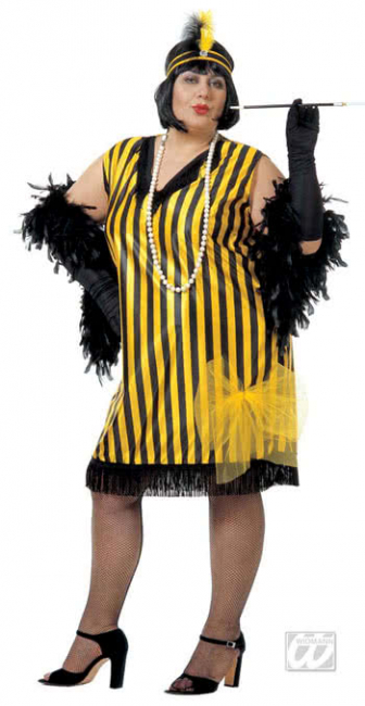 Das elegante Charleston Kostüm in Plus Size ist aus schwarz-gelben glänzenden Stoff geschneidert, ist ärmellos und an der Seite frivol geschlitzt. Kostüme in Plus Size und Übergrößen in großer Auswahl bei karneval-universe.de