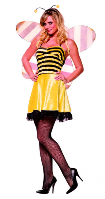Das verführerische Kostüm der frechen Honigbiene besteht aus einem Minikleid mit Spaghetti-Trägern, das als Rockfarbe ein leuchtendes, schimmerndes gelb aufweist und zum Brustbereich in eine schwarz /gelb gemustertes Top im Streifenmotiv wechselt.