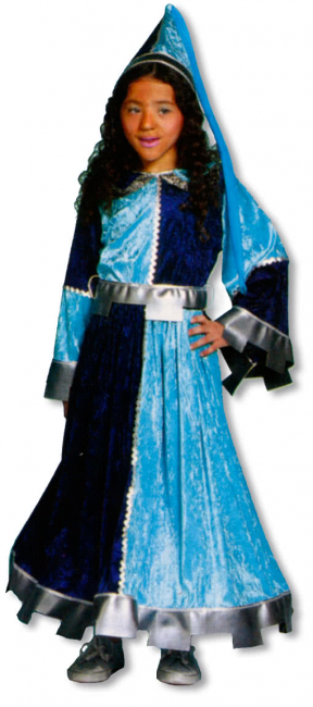 Das Kleid, türkis/dunkelblau mit Gürtel und Spitzhut, lässt alle kleinen Burgfräulein bei Hofe erstrahlen. Armbündchen, Rocksaum und Gürtel sehen aus wie Turmzinnen.